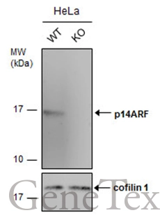 | Immunogen: | Carrier-protein conjugated synthetic peptide encompassing a sequence within the center region of human CDKN2A / p14ARF. The exact sequence is proprietary. |