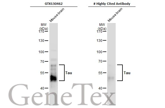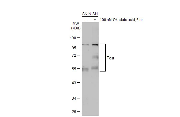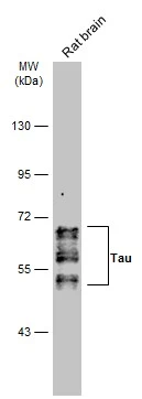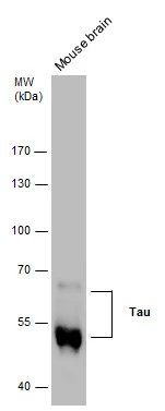 Tau antibody detects Tau protein, a phosphorylated microtubule-associated protein with a predicted molecular weight of 79 kDa. Tau protein has six isoforms in humans generated from a single gene. Expression changes of these Tau isoforms are controlled during neuronal development and in various pathological conditions. Dysfunction of Tau is associated with neurodegenerative diseases including Alzheimer's disease and frontotemporal dementia.