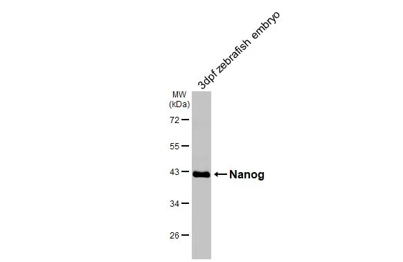 | Immunogen: | Recombinant protein encompassing a sequence within the center region of zebrafish Nanog. The exact sequence is proprietary. |