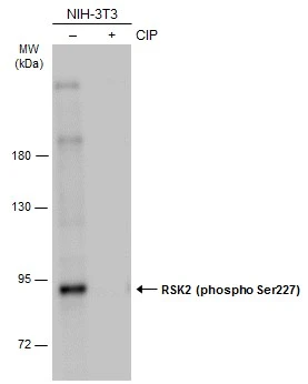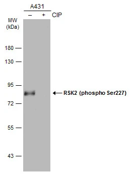 | Immunogen: | Carrier-protein conjugated synthetic peptide surrounding phospho Ser227 of human RSK2. The exact sequence is proprietary. |