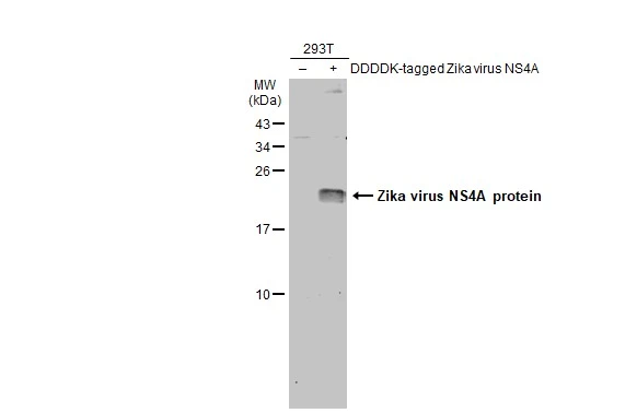 | Immunogen: | Recombinant protein encompassing a sequence within the center region of Zika virus NS4A protein (Zika virus (strain H/PF/2013)). The exact sequence is proprietary. |