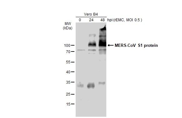 | Immunogen: | Carrier-protein conjugated synthetic peptide encompassing a sequence within the center region of MERS-CoV Spike (S1) (MERS-CoV (strain United Kingdom/H123990006/2012)). The exact sequence is proprietary. |