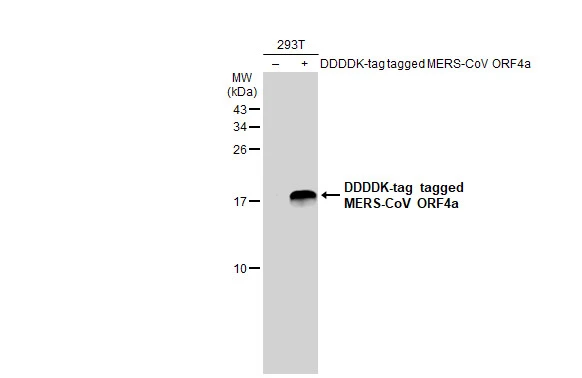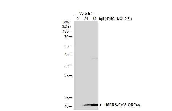 | Immunogen: | Carrier-protein conjugated synthetic peptide encompassing a sequence within the C-terminus region of MERS-CoV ORF4a (MERS-CoV (strain United Kingdom/H123990006/2012)). The exact sequence is proprietary. |