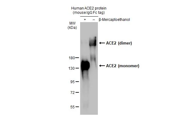 GTX135683-pro Human ACE2 (ECD) protein , mouse IgG Fc tag protein (1 µg) were separated by 7.5% SDS-PAGE, and the membrane was blotted with ACE2 antibody [N1N2], N-term (GTX101395) diluted at 1:100000. The HRP-conjugated anti-rabbit IgG antibody (GTX213110-01) was used to detect the primary antibody.