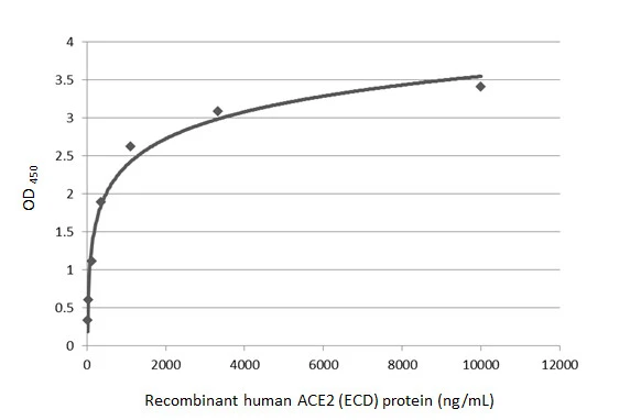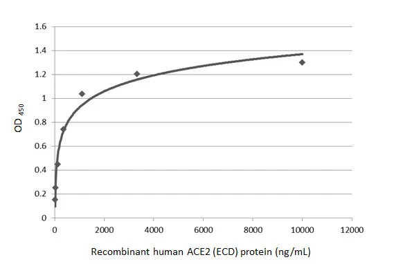 Functional ELISA analysis of immobilized recombinant SARS-CoV-2 (COVID-19) Spike RBD protein, His tag (active) (GTX01546-pro) (coated at 2 µg/mL) binding to soluble recombinant Human ACE2 (ECD) protein , mouse IgG Fc tag (GTX135683-pro) (4.5-10000 ng/mL). Bound protein was detected by ACE2 antibody [N1N2], N-term (GTX101395) (0.5 µg/mL) and Rabbit IgG antibody (HRP) (GTX213110-01) (1:10000) detected bound primary antibody.