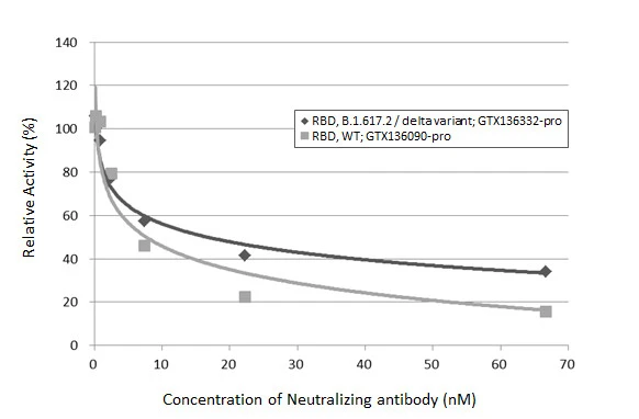Functional ELISA analysis of immobilized recombinant Spike RBD proteins of SARS-CoV-2 (COVID-19) derived from different strains (Delta variant B.1.617.2 or Wide type strain) (2 µg/mL) binding to soluble recombinant Human ACE2 (ECD) protein, mouse IgG Fc tag (active) (GTX135683-pro) (0.16-117.19 nM). Bound protein was detected by Goat Anti-Mouse IgG antibody (HRP) (GTX213111-01) (1:10000).