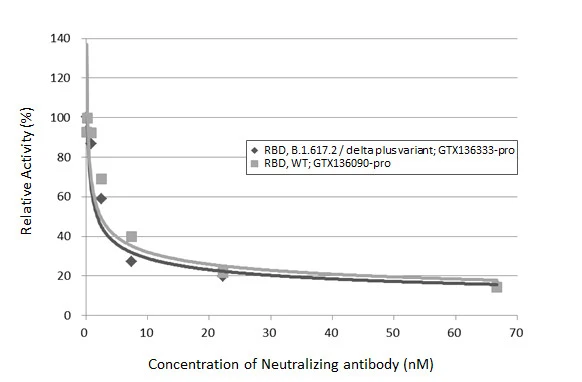 Inhibition analysis of immobilized recombinant SARS-CoV-2 (COVID-19) Spike RBD Protein, AY.1 / Delta plus variant, His tag (delta plus variant) (GTX136333-pro) and SARS-CoV-2 (COVID-19) Spike RBD protein, His tag (active) (wild type) (GTX136090-pro) (coated at 2 µg/mL) binding to soluble recombinant Human ACE2 (ECD) protein, mouse IgG Fc tag (active) (GTX135683-pro) (1000 ng/mL) ACE2 binding was inhibited by increasing concentrations of SARS-CoV-2 (COVID-19) Spike RBD antibody [HL1002] (GTX635791) (0.09-66.67 nM). Bound ACE2 was detected by Goat Anti-Mouse IgG antibody (HRP) (GTX213111-01) (1:10000).