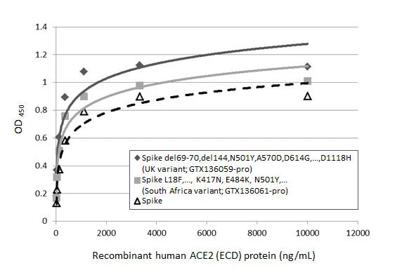 Functional ELISA analysis of immobilized recombinant SARS-CoV-2 (COVID-19) Spike (del69-70,del144,N501Y,A570D,D614G,...,D1118H) (ECD) Protein, His tag (active) (UK variant) (GTX136059-pro), SARS-CoV-2 (COVID-19) Spike ( L18F,..., K417N, E484K, N501Y,...)(ECD) Protein, His tag (active) (South Africa variant) (GTX136061-pro) and SARS-CoV-2 (COVID-19) Spike Protein (Wild type) (coated at 2 µg/mL) binding to soluble recombinant Human ACE2 (ECD) protein, mouse IgG Fc tag (active) (GTX135683-pro) (14-10000 ng/mL). Bound protein was detected by Goat Anti-Mouse IgG antibody (HRP) (GTX213111-01) (1:10000).