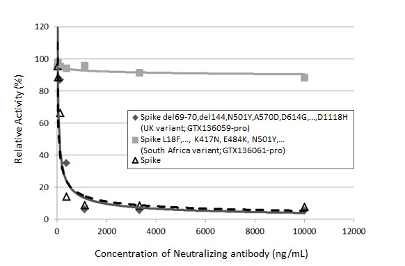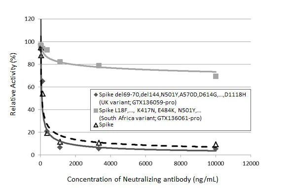 Inhibition analysis of immobilized recombinant SARS-CoV-2 (COVID-19) Spike (del69-70,del144,N501Y,A570D,D614G,...,D1118H) (ECD) Protein, His tag (active) (UK variant) (GTX136059-pro), SARS-CoV-2 (COVID-19) Spike ( L18F,..., K417N, E484K, N501Y,...)(ECD) Protein, His tag (active) (South Africa variant) (GTX136061-pro) and SARS-CoV-2 (COVID-19) Spike Protein (coated at 2 µg/mL) binding to soluble recombinant Human ACE2 (ECD) protein, mouse IgG Fc tag (active) (GTX135683-pro) (1000 ng/mL). ACE2 binding was inhibited by increasing concentrations of SARS-CoV-2 (COVID-19) Spike RBD antibody [HL1003] (GTX635792) (14-10000 ng/mL). Bound ACE2 was detected by Goat Anti-Mouse IgG antibody (HRP) (GTX213111-01) (1:10000).