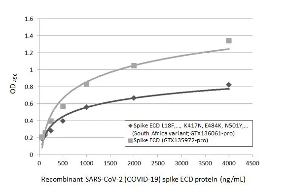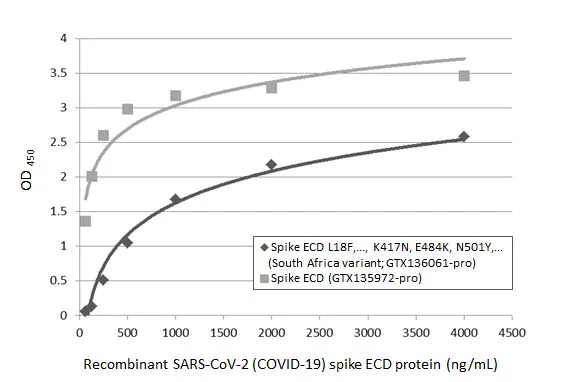 Indirect ELISA analysis performed by coating plate with recombinant SARS-CoV-2 (COVID-19) Spike ( L18F,..., K417N, E484K, N501Y,...)(ECD) Protein, His tag (active) (South Africa variant) (GTX136061-pro) and SARS-CoV-2 (COVID-19) Spike (ECD) protein, His tag (active) (GTX135972-pro) (4000-62.5 ng/mL). Coated protein was probed with SARS-CoV-2 (COVID-19) Spike RBD antibody [HL1003] (GTX635792) (1 µg/mL). Rabbit IgG antibody (HRP) (GTX213110-01) (1:10000) was used to detect bound primary antibody.