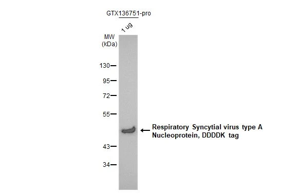 Respiratory Syncytial virus type A Nucleoprotein, DDDDK tag (1 µg, GTX136751-pro) were separated by 12% SDS-PAGE, and the membrane was blotted with DDDDK tag antibody [GT1216] (GTX636630) diluted at 1:500. The HRP-conjugated anti-rabbit IgG antibody (GTX213110-01) was used to detect the primary antibody.
