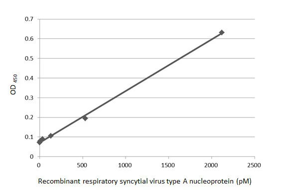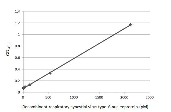 Sandwich ELISA detection of recombinant Respiratory syncytial virus type A Nucleoprotein, DDDDK tag (GTX136751-pro) using antibodies as below. Capture: Respiratory Syncytial virus Nucleoprotein antibody [HL1295] (GTX636709) (5 µg/mL) Detection: HRP-conjugated Respiratory Syncytial virus Nucleoprotein antibody [HL1247] (GTX636649) (1 µg/mL) Please notice that GTX636649 needs to be conjugated to HRP to function as the detection antibody when paired with GTX636709. Please contact us for custom HRP-conjugated antibody.
