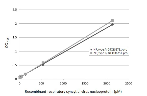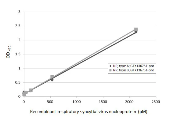 Sandwich ELISA detection of recombinant nucleoproteins (NP) derived from different strains of respiratory syncytial virus (i.e., type A; type B) using antibodies as below. Capture: Respiratory Syncytial virus Nucleoprotein antibody [HL1245] (GTX636647) (5 µg/mL) Detection: HRP-conjugated Respiratory Syncytial virus Nucleoprotein antibody [HL1291] (GTX636705) (1 µg/mL) Please notice that GTX636705 needs to be conjugated to HRP to function as the detection antibody when paired with GTX636647. Please contact us for custom HRP-conjugated antibody.
