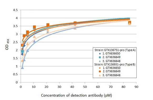 Recommended antibody pairs for Lateral Flow: Capture : GTX638184, Detection : GTX638186, or Capture : GTX636650, Detection : GTX636648 Recommended antibody pairs for sandwich ELISA: Capture : GTX636711 / GTX636649, Detection : GTX640511, or Capture : GTX636650 / GTX636649, Detection : GTX636648, or Capture : GTX636709, Detection : GTX636649, or Capture : GTX636647, Detection : GTX636705 Please notice that the detection antibody needs to be conjugated to HRP when paired with the capture antibody. Please contact us for custom HRP-conjugated antibody.