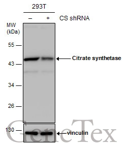 Citrate synthase antibody detects citrate synthase, the 52 kDa enzyme that catalyzes the first reaction in the citric acid cycle (Krebs cycle) to convert acetyl-CoA and oxaloacetate to citrate and CoA-SH. Citrate synthase exists within the mitochondrial matrix in eukaryotic cells and is used commonly as a marker of intact mitochondria.