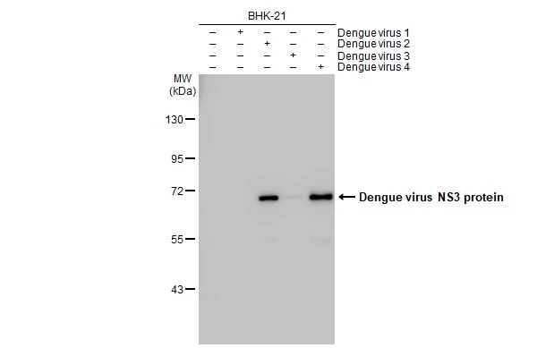 | Immunogen: | Carrier-protein conjugated synthetic peptide encompassing a sequence within the C-terminus region of Dengue virus NS3 protein (Dengue virus 2 (strain 16681 PDK 53)). The exact sequence is proprietary. |