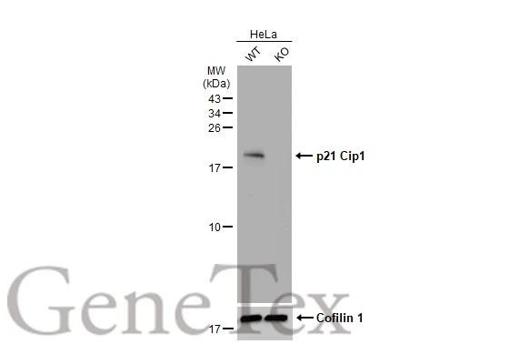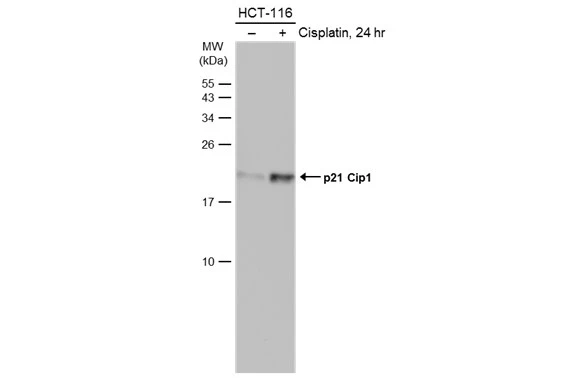 p21 (Cip1) antibody recognizes p21Cip1 protein, a cyclin-dependent kinase inhibitor with a predicted molecular weight of 18 kDa. p21 is a major downstream regulator of p53 activity in response to DNA damage to control cell cycle arrest. p21 also interacts with proliferating cell nuclear antigen (PCNA) to inhibit PCNA-dependent S-phase DNA synthesis.
