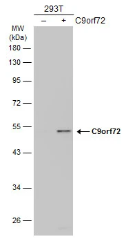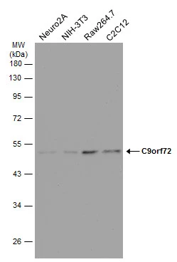 C9orf72 antibody detects the C9orf72 protein, which is 481 amino acids in length and has a predicted molecular weight of 54 kDa. The accumulation of abnormal nucleotide repeats in the C9orf72 gene is the most common genetic cause of amyotrophic lateral sclerosis (ALS) and frontotemporal dementia (FTD), accounting for approximately 34.2% and 25.9% of cases according to van Blitterswijk et al. (PMID: 23160421).