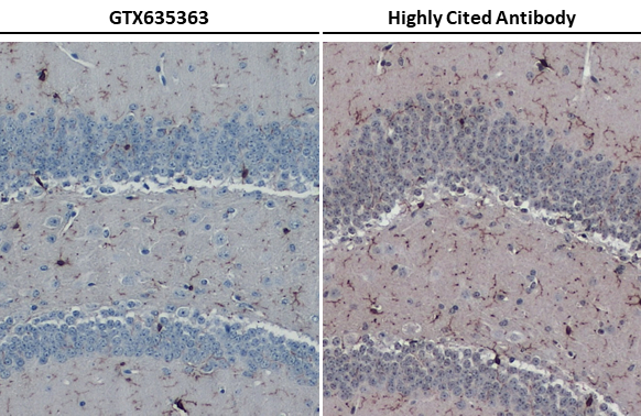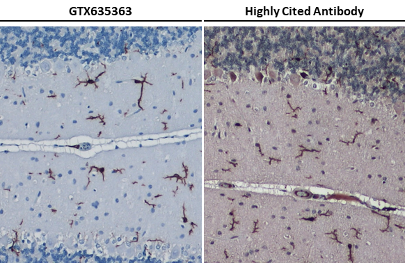 Iba1 antibody detects Iba1, a protein widely used by neuroscientists as a microglial marker and to gauge microglial activation. It is also expressed in macrophages. Discrimination between these two cell populations can be achieved via double staining with TMEM119 antibody (GTX134087), another useful microglia-specific marker, by identifying brain-residing microglia as Iba1+/TMEM119+ while CNS-infiltrating macrophages are Iba1+/TMEM119-.