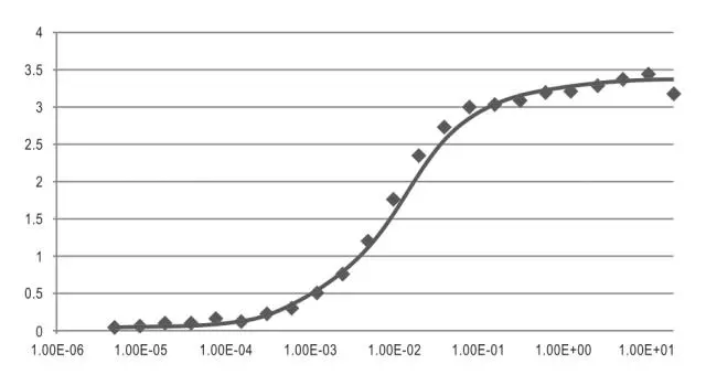 Indirect ELISA analysis performed by coating plate with recombinant full-length SARS-CoV-2 (COVID-19) nucleocapsid protein, His tag protein (GTX135592-pro) (50 ng). Coated protein probed with SARS-CoV-2 (COVID-19) nucleocapsid antibody [HL5410] (GTX635685) (20-4.8*10-6 nM). Rabbit IgG antibody (HRP) (GTX213110-01) (1:10000) detected bound primary antibody. EC50 : 0.009 nM