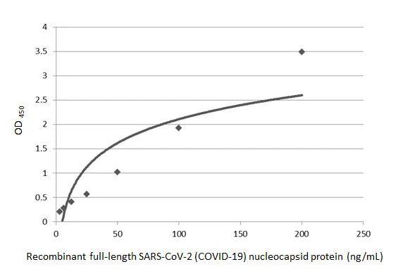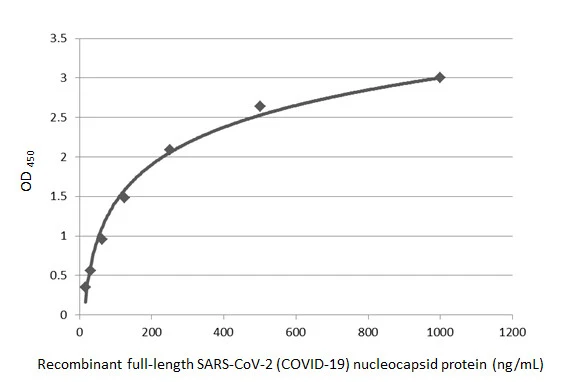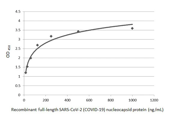 Sandwich ELISA detection of recombinant full-length SARS-CoV-2 (COVID-19) nucleocapsid protein, His tag protein (GTX135592-pro) using SARS-CoV-2 (COVID-19) nucleocapsid antibody [HL5410] (GTX635685) as capture antibody at concentration of 5 µg/mL and HRP-conjugated SARS-CoV-2 (COVID-19) nucleocapsid antibody [HL249] (GTX635678) as detection antibody at concentration of 1 µg/mL. Please notice that GTX635678 needs to be conjugated to HRP to function as the detection antibody when paired with GTX635685. Please contact us for custom HRP-conjugated antibody.