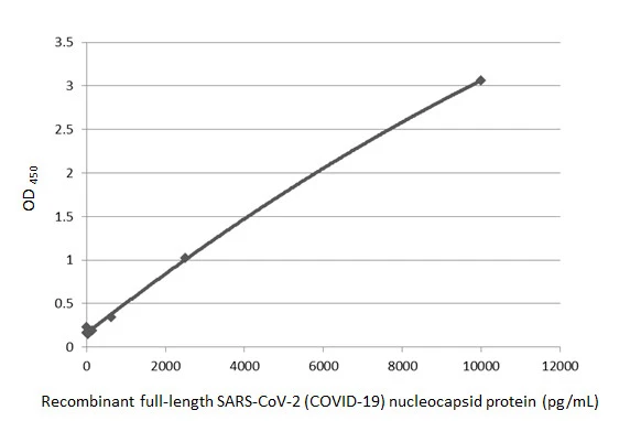 Sandwich ELISA detection of recombinant full-length SARS-CoV-2 (COVID-19) nucleocapsid protein, His tag protein (GTX135592-pro) using SARS-CoV-2 (COVID-19) nucleocapsid antibody [HL5410] (GTX635685) as capture antibody at concentration of 5 µg/mL and SARS-CoV-2 (COVID-19) nucleocapsid antibody [HL455-MS] (GTX635712) as detection antibody at concentration of 1 µg/mL. Mouse IgG antibody (HRP) (GTX213111-01) was diluted at 1:10000 and used to detect the primary antibody. Sensitivity : 2.68 pg/mL