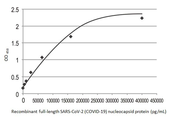 Sandwich ELISA detection of recombinant full-length SARS-CoV-2 (COVID-19) nucleocapsid protein, His tag (GTX135592-pro) using SARS-CoV-2 (COVID-19) nucleocapsid antibody [HL5410] (GTX635685) as capture antibody at concentration of 5 µg/mL and HRP-conjugated SARS-CoV-2 (COVID-19) nucleocapsid antibody [HL455] (GTX635688) as detection antibody at concentration of 1 µg/mL. Please notice that GTX635688 needs to be conjugated to HRP to function as the detection antibody when paired with GTX635685. Please contact us for custom HRP-conjugated antibody.