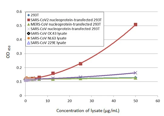 Sandwich ELISA detection of non-transfected (GTX535673) and SARS-CoV-2 (GTX535665), MERS-CoV and SARS-CoV Nucleocapsid transfected 293T whole cell extracts, SARS-CoV OC43 lysate, SARS-CoV NL63 lysate, or SARS-CoV 229E lysate using SARS-CoV-2 (COVID-19) nucleocapsid antibody [HL5410] (GTX635685) as capture antibody at concentration of 5 µg/mL and SARS-CoV-2 (COVID-19) nucleocapsid antibody [HL455-MS] (GTX635712) as detection antibody at concentration of 1 µg/mL. Mouse IgG antibody (HRP) (GTX213111-01) was diluted at 1:10000 and used to detect the primary antibody.
