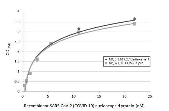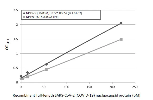 Sandwich ELISA detection of recombinant full-length Nucleocapsid proteins derived from different strains of SARS-CoV-2 virus (Wild type or B.1.617.2 delta variant) using antibodies as below. Capture: SARS-CoV-2 (COVID-19) nucleocapsid antibody [HL5410] (GTX635685) (5 µg/mL) Detection: HRP-conjugated SARS-CoV-2 (COVID-19) nucleocapsid antibody [HL455] (GTX635688) (1 µg/mL). Please notice that GTX635688 needs to be conjugated to HRP to function as the detection antibody when paired with GTX635685. Please contact us for custom HRP-conjugated antibody.