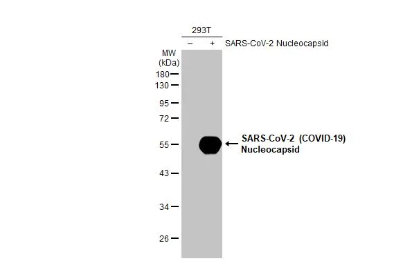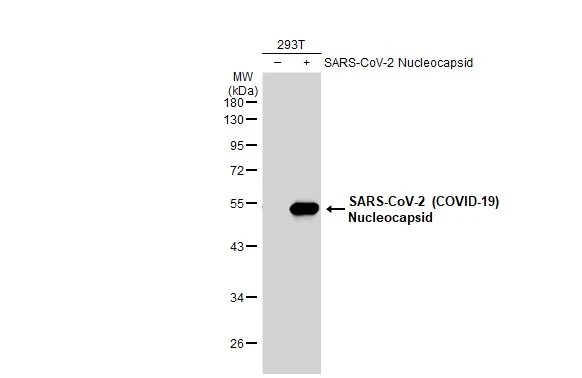 Non-transfected (-) and transfected (+) 293T whole cell extracts (30 µg) were separated by 10% SDS-PAGE, and the membrane was blotted with SARS-CoV-2 (COVID-19) nucleocapsid antibody [HL5410] (GTX635685) diluted at 1:5000. The HRP-conjugated anti-rabbit IgG antibody (GTX213110-01) was used to detect the primary antibody.