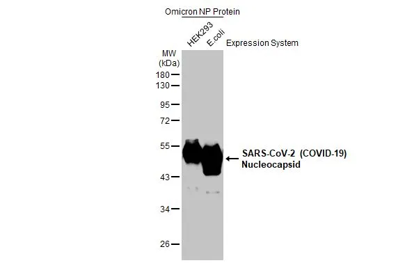 SARS-CoV-2 (COVID-19) nucleocapsid protein, B.1.1.529 / Omicron variant, His tag (0.5 µg), expressed by HEK293 cells (GTX136779-pro) or E. coli (GTX03400-pro), were separated by 10% SDS-PAGE, and the membrane was blotted with SARS-CoV-2 (COVID-19) nucleocapsid antibody [HL5410] (GTX635685) diluted at 1:20000. The HRP-conjugated anti-rabbit IgG antibody (GTX213110-01) was used to detect the primary antibody.