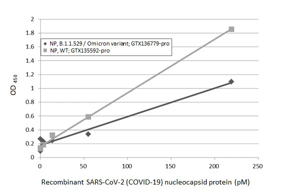 Sandwich ELISA detection of recombinant nucleocapsid protein(s) derived from different strains of SARS-CoV-2 virus (ie., Wild type; B.1.1.529 Omicron variant) using antibodies as below. Capture: SARS-CoV-2 (COVID-19) nucleocapsid antibody [HL5410] (GTX635685) (5 µg/mL) Detection: HRP-conjugated SARS-CoV-2 (COVID-19) nucleocapsid antibody [HL455] (GTX635688) (1 µg/mL) Please notice that GTX635688 needs to be conjugated to HRP to function as the detection antibody when paired with GTX635685. Please contact us for custom HRP-conjugated antibody.