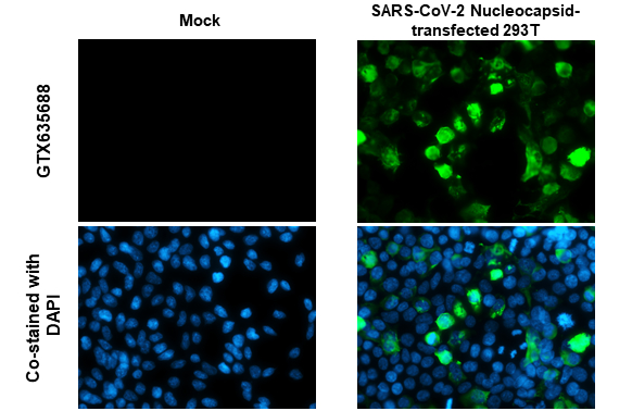 SARS-CoV-2 (COVID-19) nucleocapsid antibody [HL455] detects SARS-CoV-2 (COVID-19) nucleocapsid protein by immunofluorescent analysis. Sample: Mock and transfected 293T cells were fixed in 4% paraformaldehyde at RT for 15 min. Green: SARS-CoV-2 (COVID-19) nucleocapsid stained by SARS-CoV-2 (COVID-19) nucleocapsid antibody [HL455] (GTX635688) diluted at 1:1000. Blue: Fluoroshield with DAPI (GTX30920).