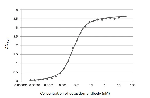 Sandwich ELISA detection of recombinant SARS-CoV-2 (COVID-19) Nucleocapsid protein, Omicron / BA.4 variant, His tag using antibodies as below. Capture: SARS-CoV-2 (COVID-19) nucleocapsid antibody [HL5410] (GTX635685) (5 µg/mL) Detection: HRP-conjugated SARS-CoV-2 (COVID-19) nucleocapsid antibody [HL455] (GTX635688) (1 µg/mL) Please notice that GTX635688 needs to be conjugated to HRP to function as the detection antibody when paired with GTX635685. Please contact us for custom HRP-conjugated antibody.
