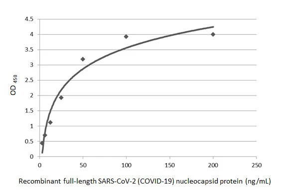 Sandwich ELISA detection of recombinant full-length SARS-CoV-2 (COVID-19) nucleocapsid protein, His tag protein (GTX135592-pro) using SARS-CoV-2 (COVID-19) nucleocapsid antibody [HL5511] (GTX635689) as capture antibody at concentration of 5 µg/mL and HRP-conjugated SARS-CoV-2 (COVID-19) nucleocapsid antibody [HL455] (GTX635688) as detection antibody at concentration of 1 µg/mL. Please notice that GTX635688 needs to be conjugated to HRP to function as the detection antibody when paired with GTX635689. Please contact us for custom HRP-conjugated antibody.