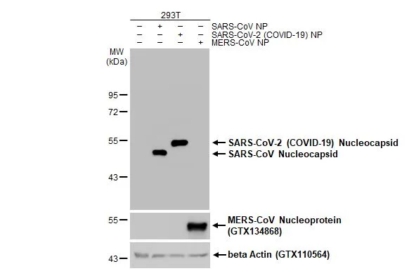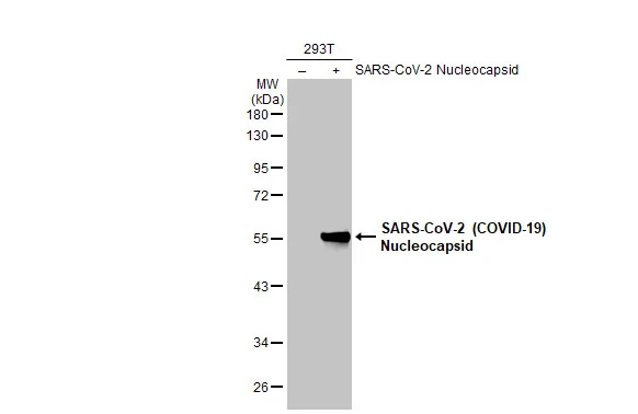 Non-transfected (-) and transfected (+) 293T whole cell extracts (30 µg) were separated by 10% SDS-PAGE, and the membrane was blotted with SARS-CoV-2 (COVID-19) Nucleocapsid antibody [HL455] (GTX635688) diluted at 1:50000. The HRP-conjugated anti-rabbit IgG antibody (GTX213110-01) was used to detect the primary antibody.