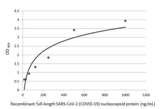 Sandwich ELISA detection of recombinant full-length SARS-CoV-2 (COVID-19) nucleocapsid protein, His tag protein (GTX135592-pro) using SARS-CoV-2 (COVID-19) nucleocapsid antibody [HL146] (GTX635680) as capture antibody at concentration of 5 µg/mL and HRP-conjugated SARS-CoV-2 (COVID-19) nucleocapsid antibody [HL455] (GTX635688) as detection antibody at concentration of 1 µg/mL. Please notice that GTX635688 needs to be conjugated to HRP to function as the detection antibody when paired with GTX635680. Please contact us for custom HRP-conjugated antibody.