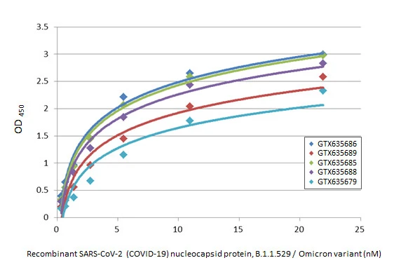 Indirect ELISA analysis performed by coating plate with recombinant SARS-CoV-2 (COVID-19) nucleocapsid protein, B.1.1.529 / Omicron variant, His tag (GTX136779-pro) (21.91-0.34 nM). Coated protein was probed with SARS-CoV-2 (COVID-19) nucleocapsid antibody [HL448] (GTX635686), SARS-CoV-2 (COVID-19) nucleocapsid antibody [HL5511] (GTX635689), SARS-CoV-2 (COVID-19) nucleocapsid antibody [HL5410] (GTX635685), SARS-CoV-2 (COVID-19) nucleocapsid antibody [HL455] (GTX635688), and SARS-CoV-2 (COVID-19) nucleocapsid antibody [HL344] (GTX635679) (1 µg/mL). Goat anti-rabbit IgG antibody (HRP) (GTX213110-01) (1:10000) was used to detect bound primary antibody.