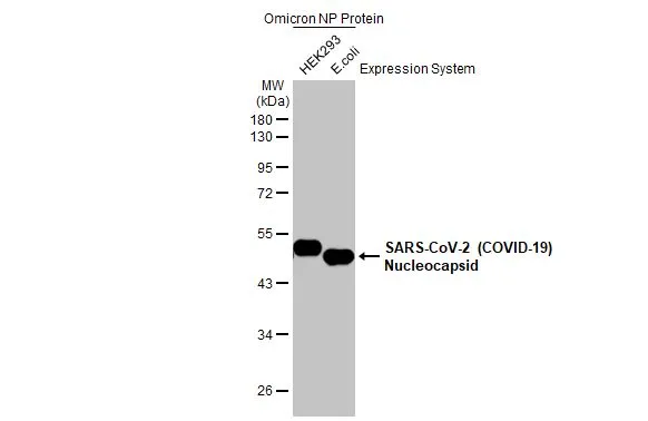 SARS-CoV-2 (COVID-19) nucleocapsid protein, B.1.1.529 / Omicron variant, His tag (GTX136779-pro | GTX03400-pro) (0.5 µg) were separated by 10% SDS-PAGE, and the membrane was blotted with SARS-CoV-2 (COVID-19) nucleocapsid antibody [HL455] (GTX635688) diluted at 1:20000. The HRP-conjugated anti-rabbit IgG antibody (GTX213110-01) was used to detect the primary antibody.