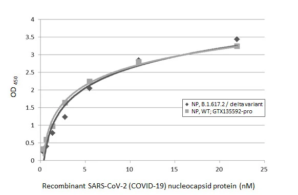 Sandwich ELISA detection of recombinant full-length Nucleocapsid proteins derived from different strains of SARS-CoV-2 (COVID-19) (Wild type or B.1.617.2 delta variant) using antibodies as below. Capture: SARS-CoV-2 (COVID-19) nucleocapsid antibody [HL5410] (GTX635685) (5 µg/mL) Detection: HRP-conjugated SARS-CoV-2 (COVID-19) nucleocapsid antibody [HL455] (GTX635688) (1 µg/mL). Please notice that GTX635688 needs to be conjugated to HRP to function as the detection antibody when paired with GTX635685. Please contact us for custom HRP-conjugated antibody.