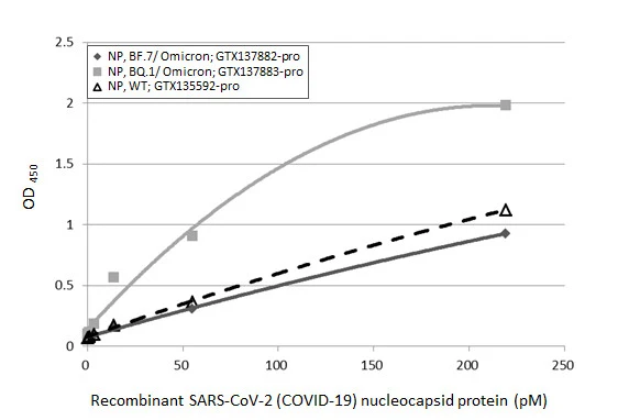 Sandwich ELISA detection of recombinant nucleocapsid protein(s) derived from different strains of SARS-CoV-2 virus (ie., Wild type; BF.7 Omicron variant; BQ.1 Omicron variant) using antibodies as below. Capture: SARS-CoV-2 (COVID-19) nucleocapsid antibody [HL455] (GTX635688) (5 µg/mL) Detection: HRP-conjugated SARS-CoV-2 (COVID-19) nucleocapsid antibody [HL5511] (GTX635689) (1 µg/mL) Please notice that GTX635689 needs to be conjugated to HRP to function as the detection antibody when paired with GTX635688. Please contact us for custom HRP-conjugated antibody.