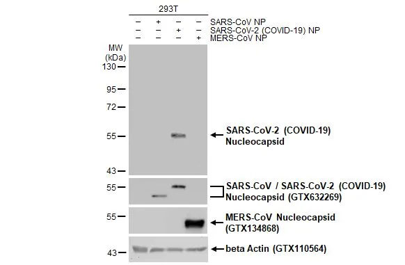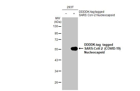 Non-transfected (-) and transfected (+) 293T whole cell extracts (30 µg) were separated by 10% SDS-PAGE, and the membrane was blotted with SARS-CoV-2 (COVID-19) Nucleocapsid antibody [HL5511] (GTX635689) diluted at 1:5000. The HRP-conjugated anti-rabbit IgG antibody (GTX213110-01) was used to detect the primary antibody.