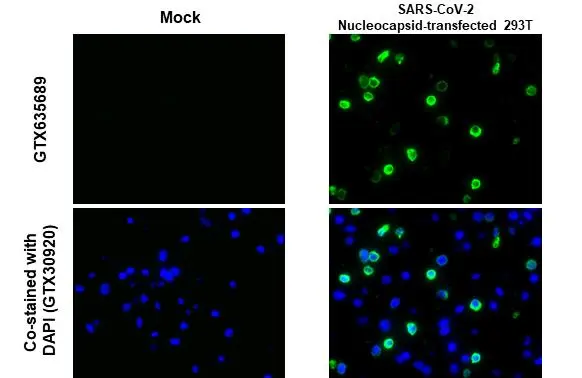 SARS-CoV-2 (COVID-19) nucleocapsid antibody [HL5511] detects SARS-CoV-2 (COVID-19) nucleocapsid protein by immunofluorescent analysis. Sample: Mock and transfected 293T cells were fixed in 4% paraformaldehyde at RT for 15 min. Green: SARS-CoV-2 (COVID-19) nucleocapsid stained by SARS-CoV-2 (COVID-19) nucleocapsid antibody [HL5511] (GTX635689) diluted at 1:1000. Blue: Fluoroshield with DAPI (GTX30920).