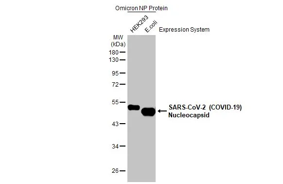 SARS-CoV-2 (COVID-19) nucleocapsid protein, B.1.1.529 / Omicron variant, His tag (0.5 µg), expressed by HEK293 cells (GTX136779-pro) or E. coli (GTX03400-pro), were separated by 10% SDS-PAGE, and the membrane was blotted with SARS-CoV-2 (COVID-19) nucleocapsid antibody [HL5511] (GTX635689) diluted at 1:20000. The HRP-conjugated anti-rabbit IgG antibody (GTX213110-01) was used to detect the primary antibody.