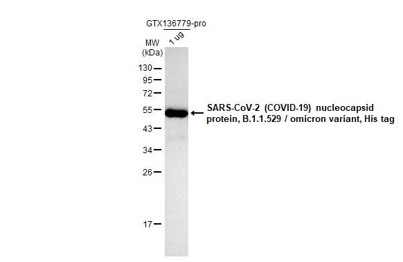 SARS-CoV-2 (COVID-19) nucleocapsid protein, B.1.1.529 / omicron variant, His tag (1 µg, GTX136779-pro) were separated by 12% SDS-PAGE, and the membrane was blotted with SARS-CoV-2 (COVID-19) nucleocapsid antibody [HL5511] (GTX635689) diluted at 1:5000. The HRP-conjugated anti-rabbit IgG antibody (GTX213110-01) was used to detect the primary antibody.