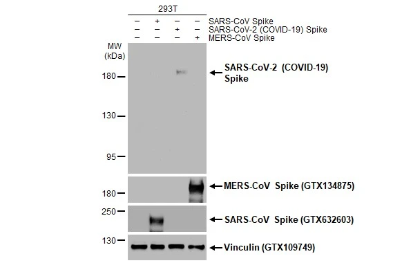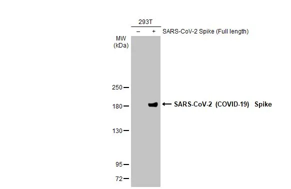 Non-transfected (-) and transfected (+) 293T whole cell extracts (30 µg) were separated by 5% SDS-PAGE, and the membrane was blotted with SARS-CoV-2 (COVID-19) Spike S2 antibody [HL237] (GTX635693) diluted at 1:5000. The HRP-conjugated anti-rabbit IgG antibody (GTX213110-01) was used to detect the primary antibody.