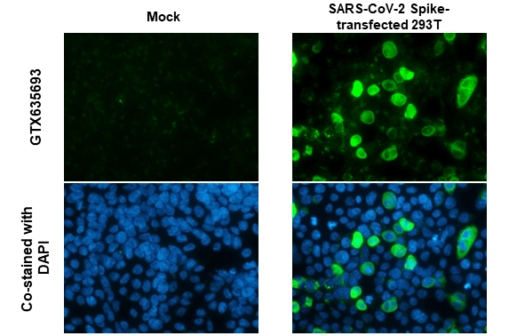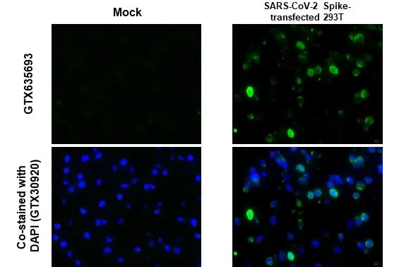 SARS-CoV-2 (COVID-19) Spike S2 antibody [HL237] detects SARS-CoV-2 (COVID-19) Spike S2 protein by immunofluorescent analysis. Sample: Mock and transfected 293T cells were fixed in 4% paraformaldehyde at RT for 15 min. Green: SARS-CoV-2 (COVID-19) Spike S2 stained by SARS-CoV-2 (COVID-19) Spike S2 antibody [HL237] (GTX635693) diluted at 1:1000. Blue: Fluoroshield with DAPI (GTX30920).