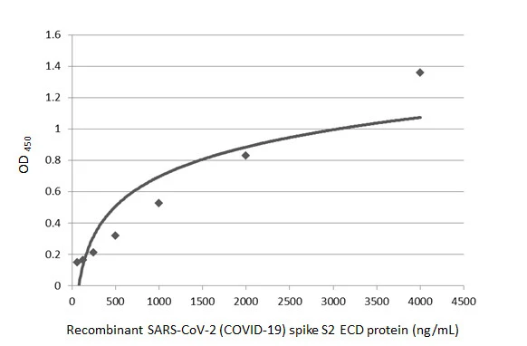 Sandwich ELISA detection of recombinant SARS-CoV-2 (COVID-19) Spike S2 (ECD) protein, mouse IgG Fc tag protein (GTX135684-pro) using SARS-CoV / SARS-CoV-2 (COVID-19) spike antibody [1A9] (GTX632604) as capture antibody at concentration of 5 µg/mL and SARS-CoV-2 (COVID-19) Spike S2 antibody [HL237] (GTX635693) as detection antibody at concentration of 1 µg/mL. Rabbit IgG antibody (HRP) (GTX213110-01) was diluted at 1:10000 and used to detect the primary antibody.