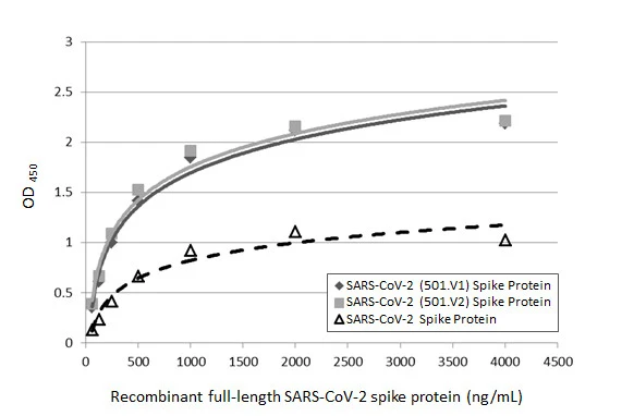 Indirect ELISA analysis performed by coating plate with recombinant full-length SARS-CoV-2 (501.V1) spike protein, SARS-CoV-2 (501.V2) spike protein and SARS-CoV-2 spike protein (4000-62.5 ng/mL). Coated protein was probed with SARS-CoV-2 (COVID-19) Spike S2 antibody [HL237] (GTX635693) (1 µg/mL). Rabbit IgG antibody (HRP) (GTX213110-01) (1:10000) was used to detect bound primary antibody.