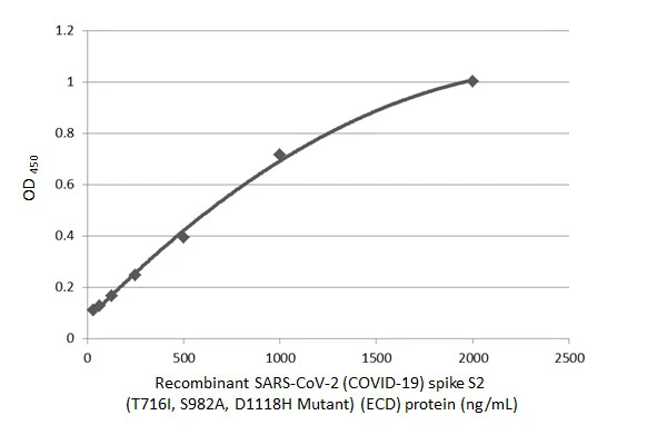 Sandwich ELISA detection of recombinant SARS-CoV-2 (COVID-19) Spike S2 (T716I, S982A, D1118H Mutant) (ECD) protein, His tag (GTX136023-pro) using SARS-CoV / SARS-CoV-2 (COVID-19) spike antibody [1A9] (GTX632604) as capture antibody at concentration of 5 µg/mL and SARS-CoV-2 (COVID-19) Spike S2 antibody [HL237] (GTX635693) as detection antibody at concentration of 1 µg/mL. Rabbit IgG antibody (HRP) (GTX213110-01) was diluted at 1:10000 and used to detect the primary antibody.